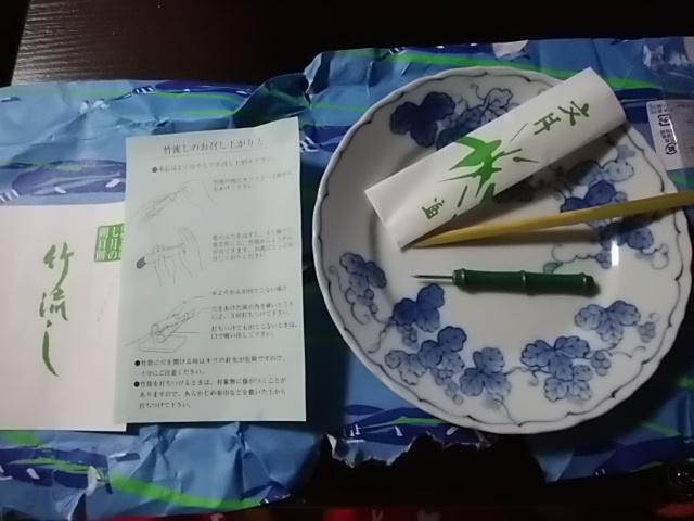赤福もち、7月の朔日餅は竹筒の中に水ようかんを封入した『竹流し』というものでした。これは去年も買って、ふうふう言いながら食べた思いがあります。青竹が五本、お尻のところに節があり先っちょは竹の皮で包まれていました。
