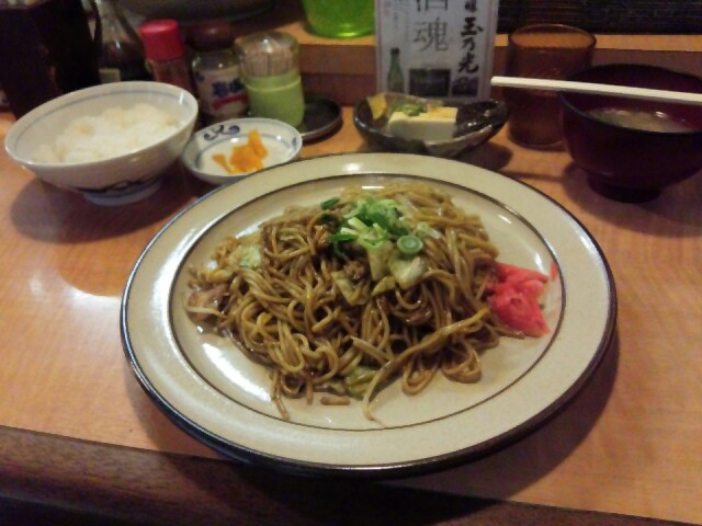 先日4月1日に行ったときには、この焼きそば定食がなくて断念したのです。それ以来、この焼きそばが食べたくて昨日の5日無事に食べてきました。焼きそばW定食が同じ値段で540円(税込)でした。長いカウンターの中でおばあさんと男性の店員の二人がいて、主に焼きそばを焼くのがおばあさんの仕事になっていました。時々、焼きそばを焼いた後「これどこや?」と尋ねたり、「次は何玉や?」と尋ねたりして、男の店員が「ちゃんと覚えてや!」ときつく返事をしたりしていたのですが、その時にいた客はみなさん常連さんらしく、そんなやりとりを気にせず、すまして聞いていました。