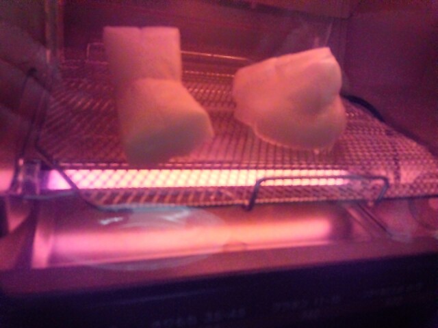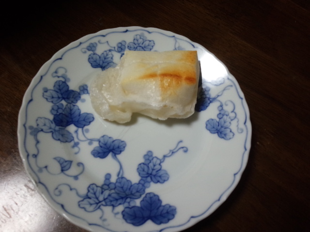 見事に下からはみだして割れるはずの所が頑丈な感じで焦げ付いています。でもお餅はおいしいです。今夜は卵入りきつねうどんの中に入れて力うどんにしていただきました。
