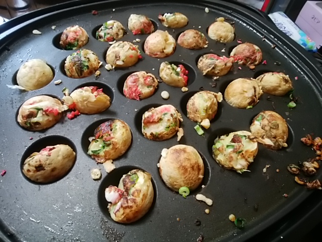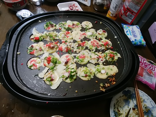 今日のお昼はたこ焼きにしてみました。新元号の発表をテレビで見ながら次から次へと準備をしました。まず、タコとたこ焼きソースを買いに行きました。スマホでたこ焼きのレシピを調べると東京の方ではキャベツを入れたたこ焼きを作ると書いてあったので、キャベツ入りたこ焼きを作ることにしました。青のりと紅ショウガがなかったのでまたまたスーパーへ買い物に行きました。そのあとキャベツを切ろうとしたのですが、包丁の切れ味が今ひとつだったので砥石を出して研ぐことにしました。10分ほど包丁研ぎをしてからキャベツのみじん切りと青ネギの細切りをしました。この写真は2回目の焼きなので1度目の汚れが残っていますが、14個食べることができました。