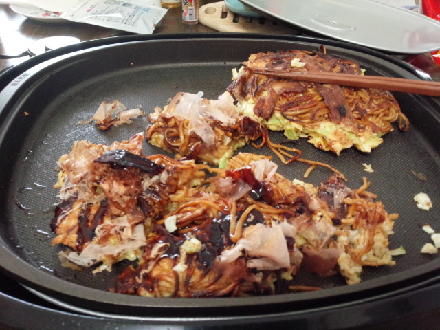 焼きそばソースで焼きそばを炒め、半分残してモダン焼き作りました。大きな袋に入っているかつお節も買いました。