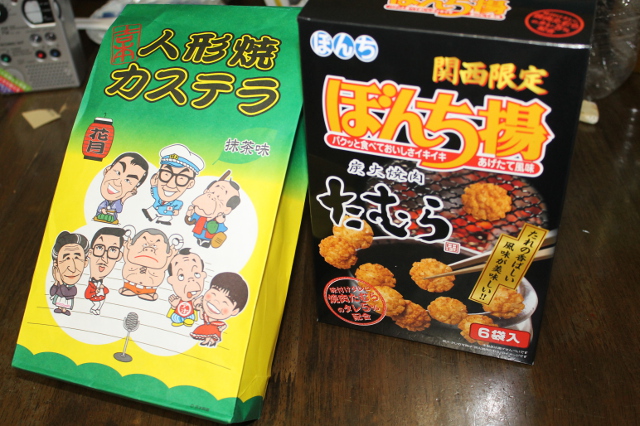 漫才や落語や新喜劇を楽しんだそうです。おみやげに買ってきたのが下の人形焼きカステラの抹茶風味と炭火焼肉田村のぼんち揚げです。
