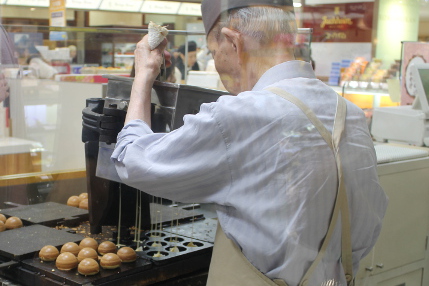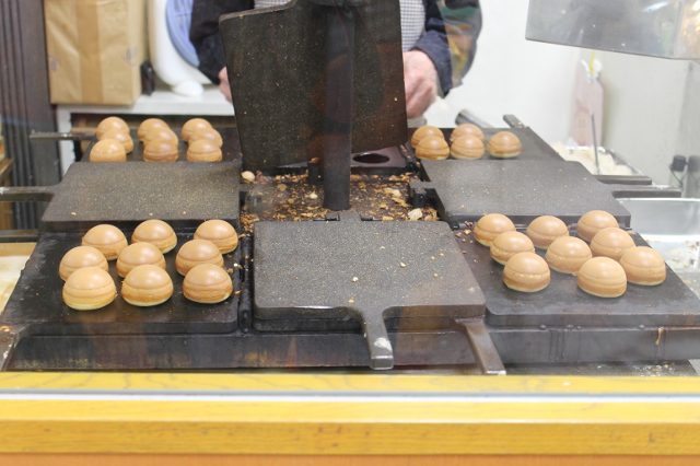 一昨年の写真です。九つの丸いくぼみのある鉄板を使って、九つの穴から卵の入った生地を流し入れます。菓子職人のおじいさんが白あんをチョンチョンチョンチョンと生地の中に入れていきます。あとはクルッと一周回ってくる間に焼き上がっているという寸法です。