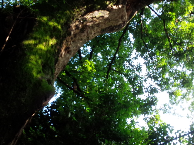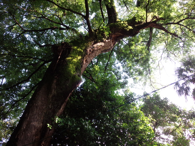 阪急バス宮の前のバス停の北にある五字神社にアオバズクが戻っていました。今朝見上げたところ、オスとメスが大きな幹の左右に止まっていました。この写真はメスのほうです。