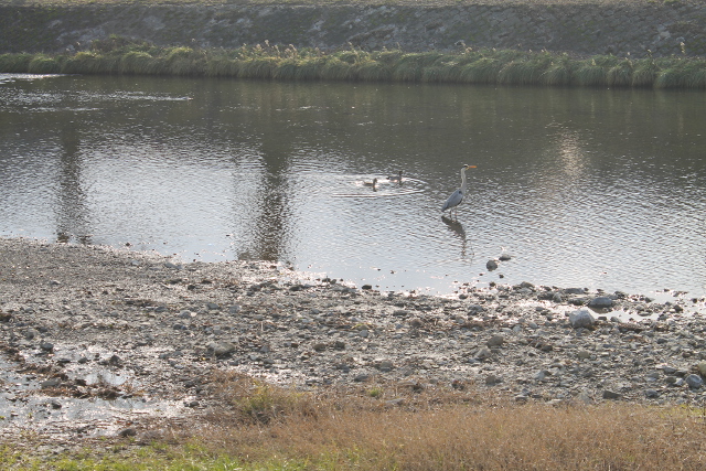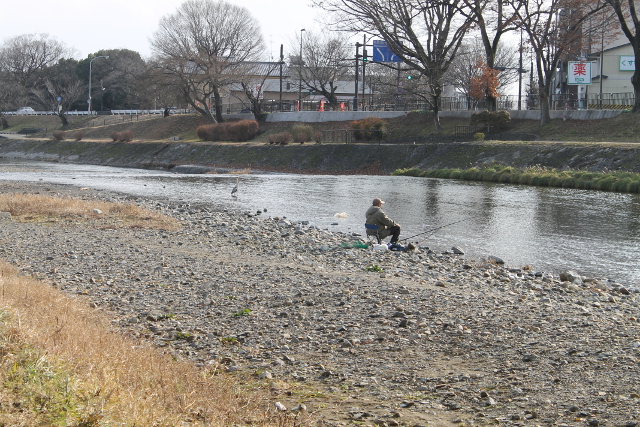 鴨川で見かけた光景です。まるでサギが見守るようにして釣りをする人を見つめていました。冬の日の午後、暖かい陽射しを浴びて、釣りをする人とサギの時間が過ぎていきます。