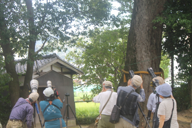 神社に向かうとたくさんの人たちがカメラを据えて木の上をめがけていました。