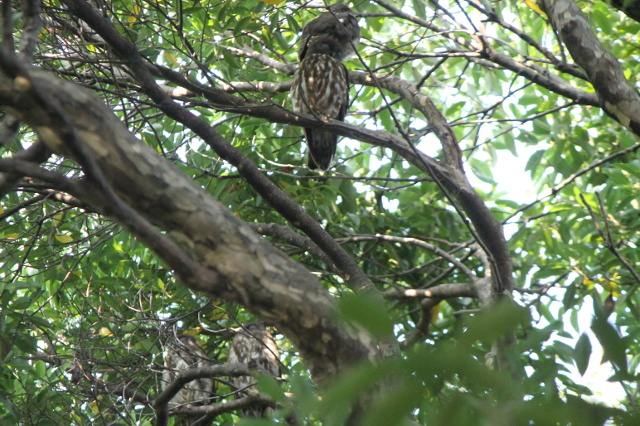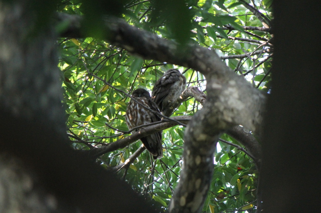いろいろと仰ぎ見る場所を変えて見て、はっきりと二羽の姿が見える場所を見つけました。二羽のアオバズクが仲良く近づいて留まっているのがはっきりと分かりました。