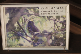 神社にかかっているアオバズクの写真と説明書きの額です。8月中頃までと書いてあるのでもう少しでサヨナラです。