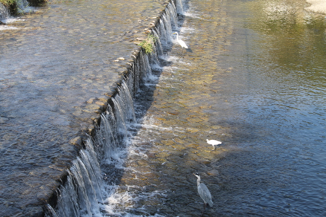 鴨川(かもがわ)で見(み)かけた鷺(さぎ)たちの魚(さかな)取(と)り風景(ふうけい)です。小(ちい)さな魚(さかな)が下(くだ)ってくるのですね。