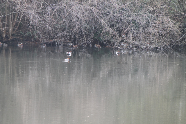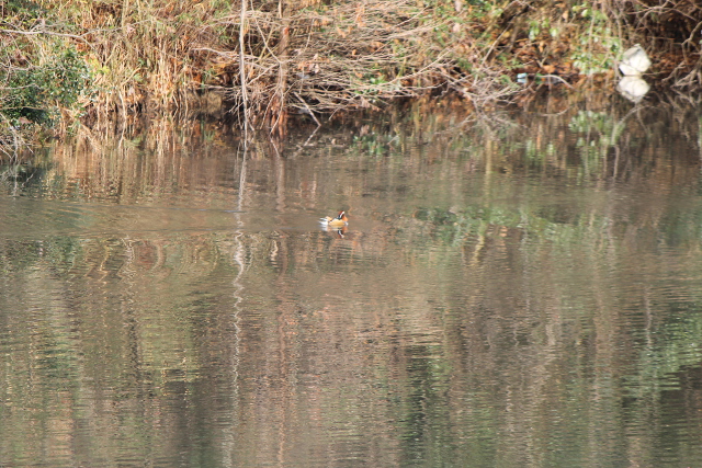 鳥見台のところには三脚を準備した先客がいて『さっきまでオシドリがたくさん出てたよ。』と知らせてくれました。もう10分早く着いていたら、もうちょっといい写真が撮れたのですが、仕方ありません。池の真ん中より向こうの方にオシドリが二羽、左から右へ泳いでいました。
