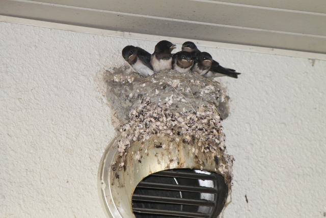 箕面(みのお)の駅(えき)の改札口(かいさつぐち)を入(はい)ってすぐ、壁際(かべぎわ)の頭(あたま)の上(うえ)にツバメの巣(す)が2つあります。その右側(みぎがわ)の巣(す)にヒナが5羽(わ)大(おお)きく成長(せいちょう)してきています。もう飛(と)んでもいいと思(おも)う大(おお)きさのように思(おも)いますが、まだ巣(す)の中(なか)で押(お)し合(あ)いへし合(あ)いしています。この下(した)を通(とお)って、人間(にんげん)たちが忙(いそが)しく電車(でんしゃ)に乗(の)ったり、電車(でんしゃ)から降(お)りてきたりしているのをこのツバメたちは見(み)てきたのでしょうね。