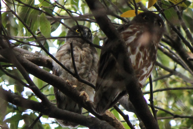 定点での撮影場所を先客の人にとられてしまっていたので、五羽一度に撮すポジションがうまく撮れませんでした。この写真、前が親鳥ですね。ストロボの光りに心配そうにしています。