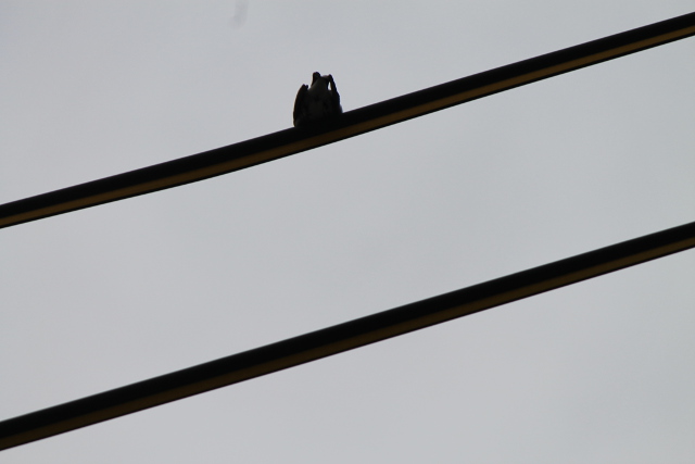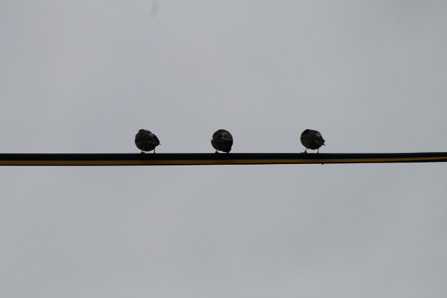 きょうは一年の中で折り返しの日だそうです。今日の正午がちょうど一年の真ん中だったそうです。電線にたくさんの鳥が留まっていたのでカメラを準備して戻ってみるとたくさんいた鳥が木の葉の中に飛んで行ってしまい、たった三羽だけが待っていてくれました。