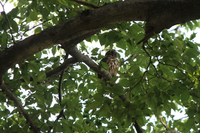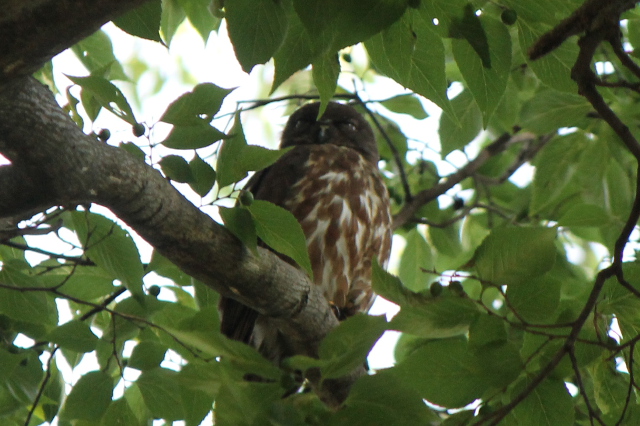 アオバズクの姿を一昨日、目にすることが出来たので、今朝、愛用の一眼レフを持って五字神社に行きました。ご神木を見あげてじーっとにらんでいると上からの視線を感じました。いました。でも今朝は一羽しかいませんでした。ひょっとすると卵を温めているのではと思い、木の上の方のねぐらがどこにあるのかを探しましたが分かりませんでした。