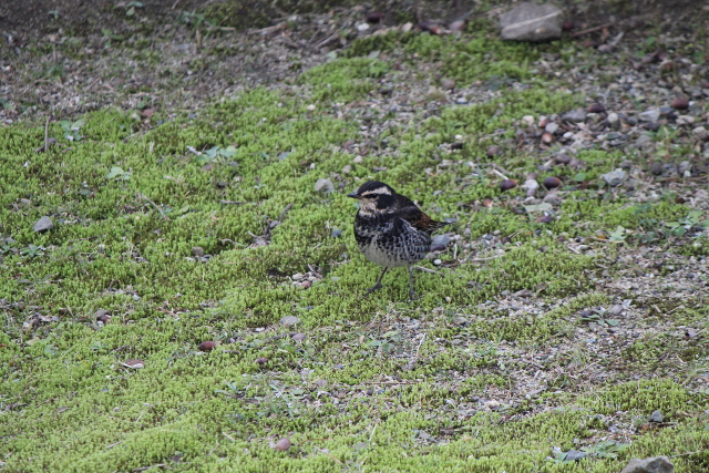土曜日の朝、ひょろひょろ伸びたオリヅルランの鉢をベランダに持って行くと、下から一羽の鳥がチョコチョコとやってきて私の方を見あげました。