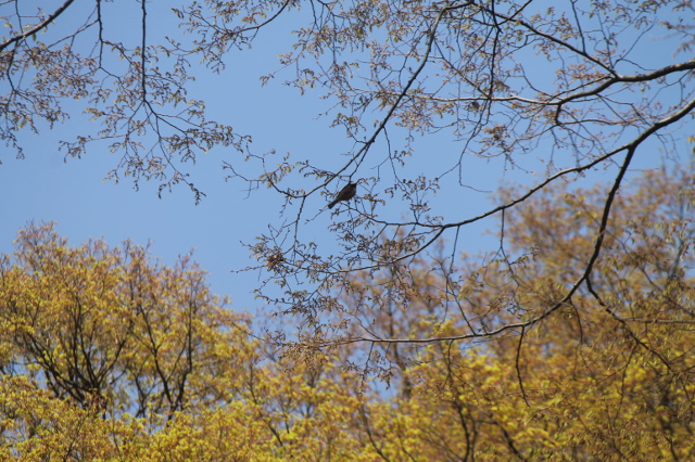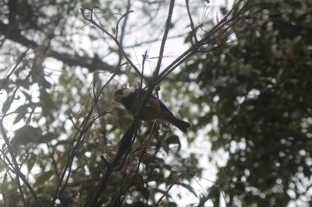 古参道で以前、餌場があった付近のベンチに座るとかなり近寄ってきた山雀(やまがら)でしょうか?何もないとわかるとすぐに飛んで行ってしまいました。
