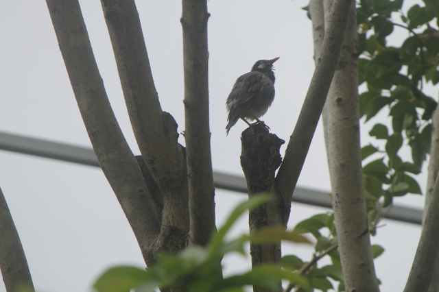 朝一番にギィーギィーとかなりうるさい鳥がやってきました。ベランダに出て鳥の声のする方をながめると、ヒナのような鳥が木の上に留まっていました。急いでカメラを準備して望遠で撮影しましたが、木の上に留まっている姿はこの一枚しか撮れませんでした。