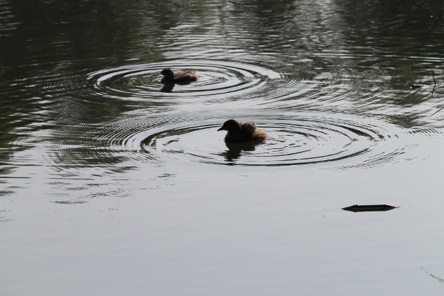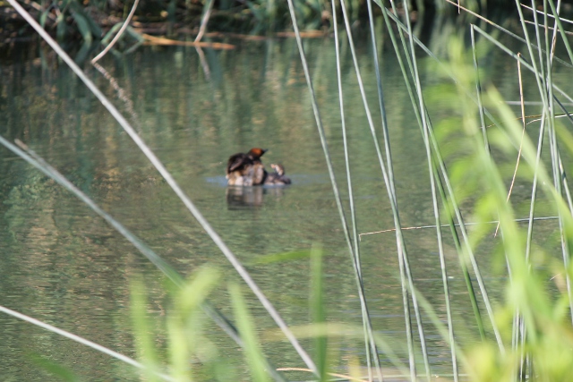 手前のかいつぶりの背中にヒナが載っているようです。かいつぶりのヒナはよく背中に載るそうです。