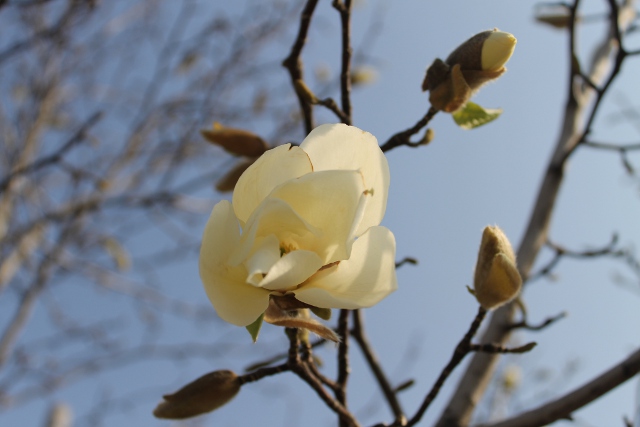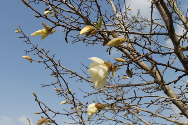 朝早くにこぶしの花の下に行きました。少しずつ咲き出しています。