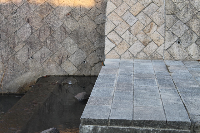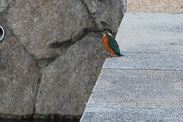 今朝の千里川です。バンの鳴き声がするので川辺におりてカメラを準備していたら、上の方から緑の鳥が目の前をピューッと降りてきてピタッと石畳のヘリに着地しました。やっと準備できたカメラでいそいで撮った写真がこれです。