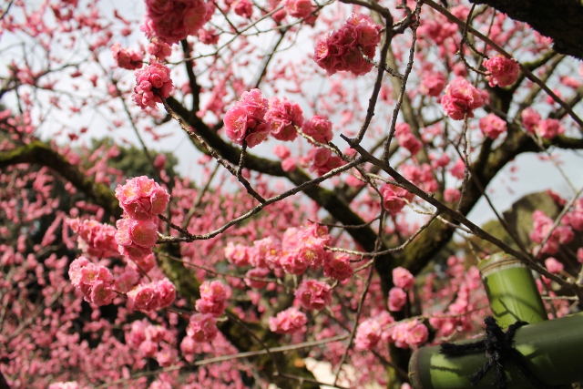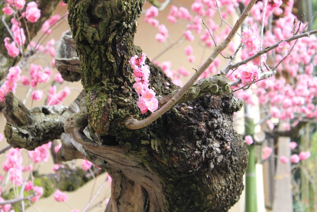 写真のようにゴツゴツした老木の幹と艶やかな八重咲きのぼんぼりのような花との対比が面白いです。