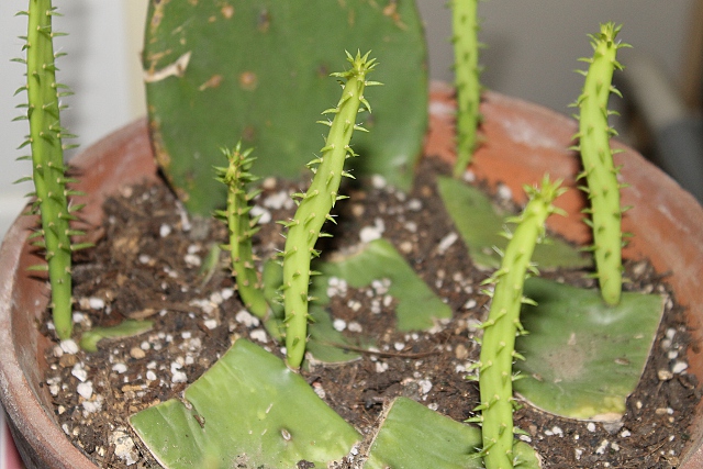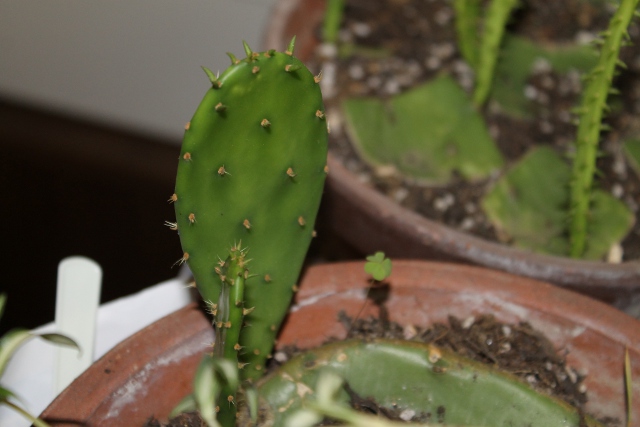 小さく突きだしたヒョロヒョロの新芽と比べて先行した兄貴分の仙人掌の芽はその名の通りうちわの形をなしてきました。トゲもど真ん中が尖って痛そうです。