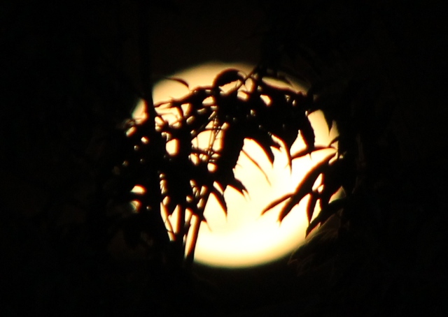久し振りに大きな月を眺めました。月の出の時間が遅かったので9時を過ぎてもまだ登り切っておらず、木の葉越しの撮影になってしまいました。