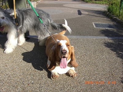おじいさんが犬を三匹連れて散歩していたのですが、上の写真の犬が道にべたーっとしゃがみ込んで動かなくなっていました。おじいさんは声をかけて歩かせようとするのですがかなり肥満気味のこの犬はなかなか動きません。仕方がないのでおじいさんを助けるためにカメラを向けると見ず知らずの人間が来たということで重い腰を上げて歩き出しました。