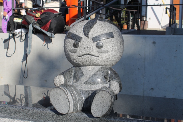 阪急箕面駅前に鎮座している滝の道ゆずるくんの石像です。
