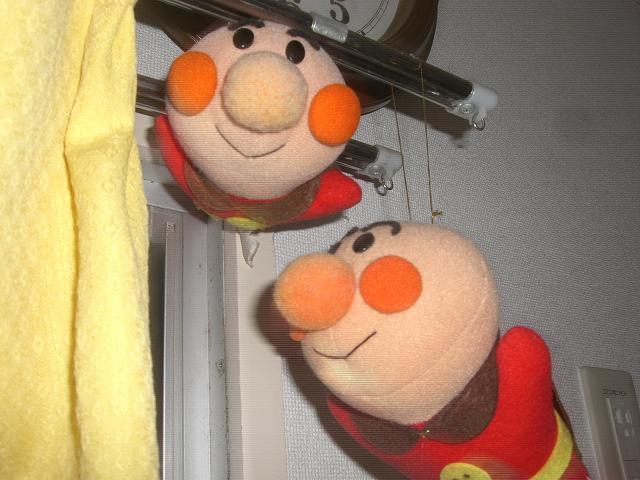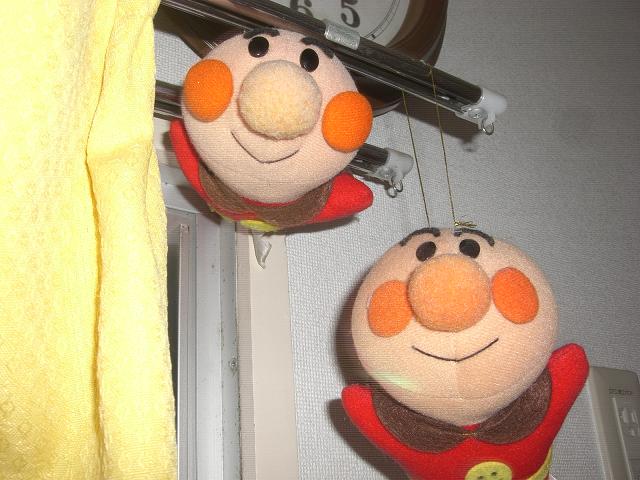 このアンパンマンの人形はショッピングセンターの駐車場で雨に濡れていました。おうちに持って帰ってきれいに洗い、糸でぶら下げました。いつもニコニコ笑っています。