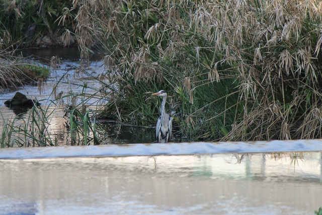 隣の川の方へ歩いていくと大きな鳥が向こうの方に立ってこちらを見ていました。サギでしょうね。