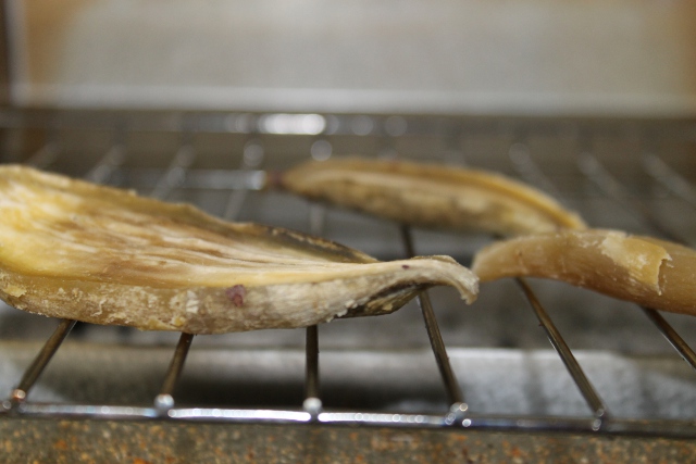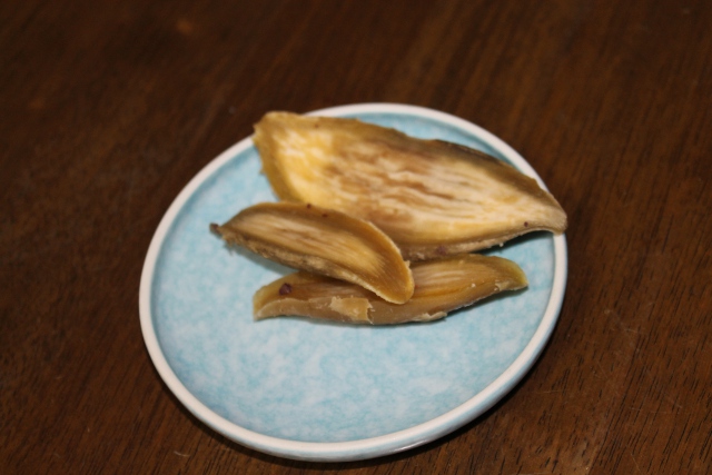 干しイモが出来上がりました。そのまま噛んでみたのですが、かなり固いのでオーブン・トースターで焼いてみました。
