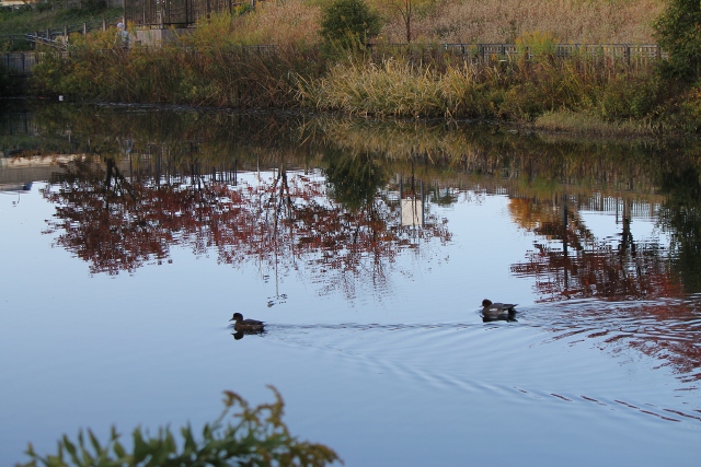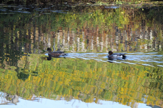 カモが二羽、池の中央を優雅に泳いでいました。カメラを構えるとカモに焦点のレッドポイントを合わせたのですが、池の水面に映る赤い紅葉にピントが合ってしまいました。
