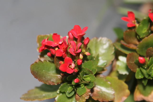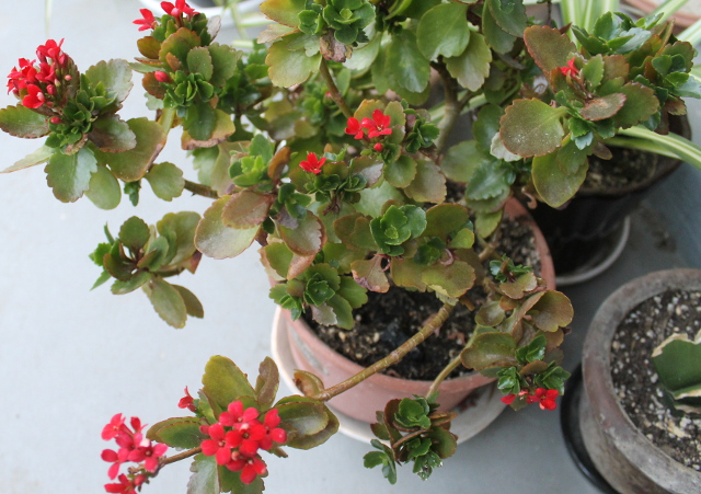 カランコエの花(はな)が咲(さ)き始(はじ)めています。ベランダに置(お)いている鉢(はち)の方(ほう)に真っ赤(まっか)な花(はな)がつきました。