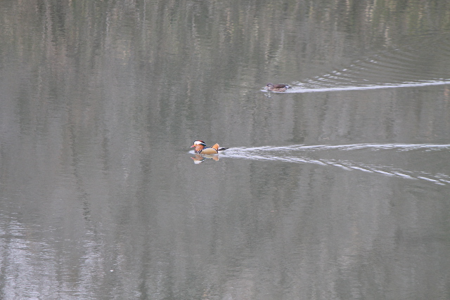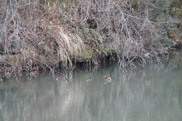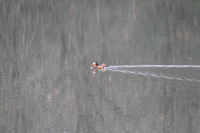いつもと違(ちが)う鳴(な)き声(ごえ)が聞(き)こえてきたのでもしかするとと思(おも)いながら望遠(ぼうえん)レンズに変(か)えながらいつもの鳥見台(とりみだい)に急(いそ)ぎました。いつもなら何人(なんにん)かいるアマチュアカメラマンが一人(ひとり)もおりません。やっぱり鴨(かも)さんだけか、とちょっとがっかりしながら池(いけ)を覗(のぞ)きました。すると、いるわいるわ!かなり遠(とお)くの岸(きし)ですが、数羽(すうわ)の鴛鴦(オシドリ)が動(うご)いているのが見(み)えました。