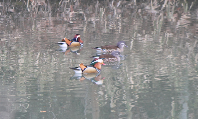 オスメスの二羽(にわ)ずつがカモさんたちに向(む)かって泳(およ)いでいました。望遠(ぼうえん)レンズではっきりと鴛鴦(おしどり)の姿(すがた)を見(み)ることができました。
