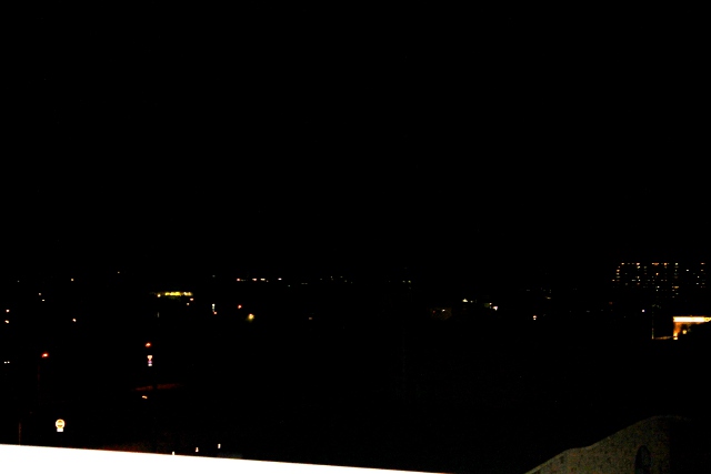 その駐車場からカメラを外に向けてみました。午後九時の箕面の街です。