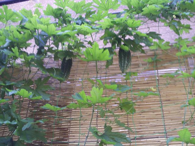 陽のよく当たる方のゴーヤの棚には黄色いゴーヤの実がぶら下がっていました。