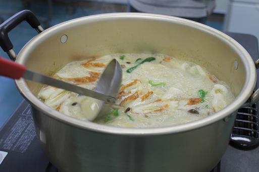 ココナッツミルクとナンプラーを入れて、今回は豚肉とピーマン、タケノコ、ちくわを入れました。