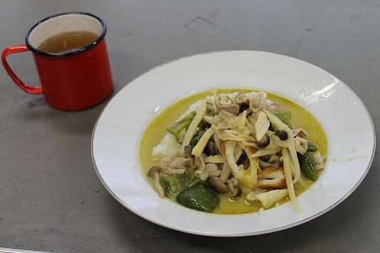 本来のタイカレーは鶏肉とココナツミルクとナンプラーに、タケノコ、パプリカとかピーマンを入れるのですが、今回は豚肉とちくわを入れました。