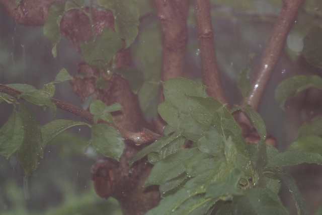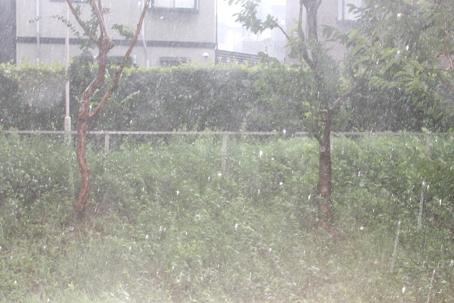 よそ事のようにテレビを見ていたら、まず風が吹き始め、続いて雷の音、それからすごい雨。網戸から雨が風に乗って入ってきて急いでガラス戸をしめました。テレビの雷の音と、家の近くで鳴る雷の音の区別がわからなくなるほどでした。まだ明るいときの豪雨です。