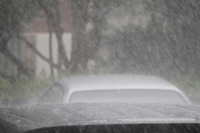 車の屋根に降るものすごい大きな雨粒を撮影してみたかったのですが、ピントが合いません。