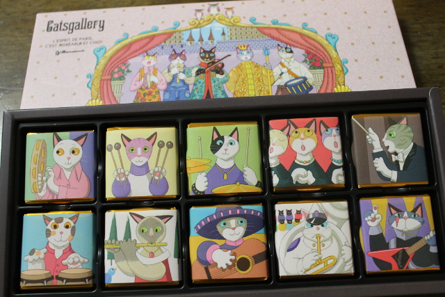箱(はこ)を開(あ)けてもまた一つ一つのチョコレートの包(つつ)みにネコの絵(え)がありました。