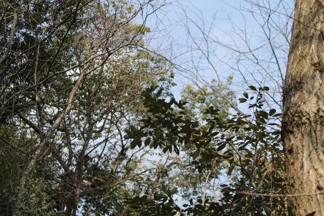 鳥の動きが頭上で見えるのですが、シャッターチャンスがなかなか廻ってきません。次の写真は鳥が枝に止まった瞬間にシャッターを切ったのですが、鳥の姿は見えません。