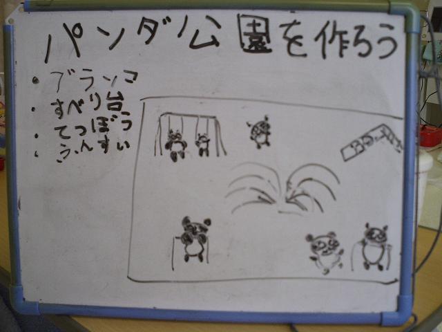 パンダの写真集を見てパンダが大好きになった小学生が、ホワイトボードにパンダ公園を描いてくれました。