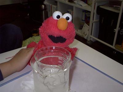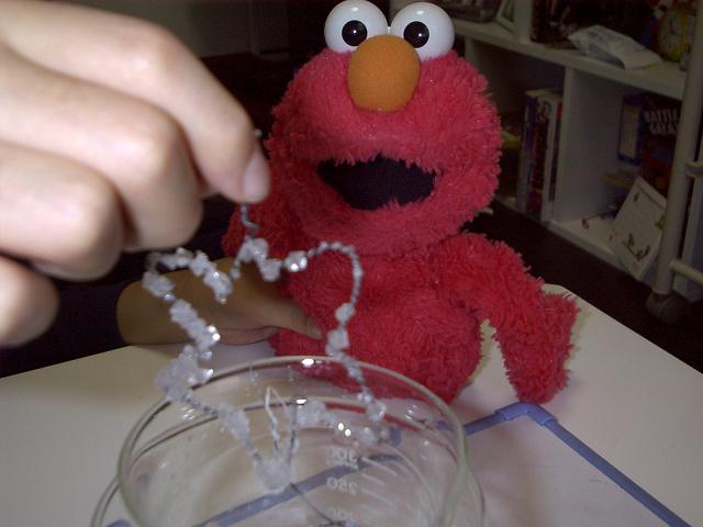 80度ぐらいのお湯を準備し、小さなビーカーに入れてそこにミョウバンの粉末を入れていき、かなりの量を溶かしました。そこへ糸を巻いた針金をいれて、その小さなビーカーを氷を入れた大きなビーカーに入れます。