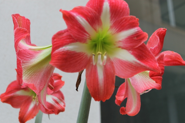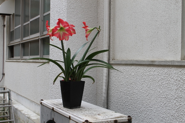 病院のゴーヤの植えられているコーナーに向かいあうように、台の上に置かれた君子蘭の花が咲いていました。