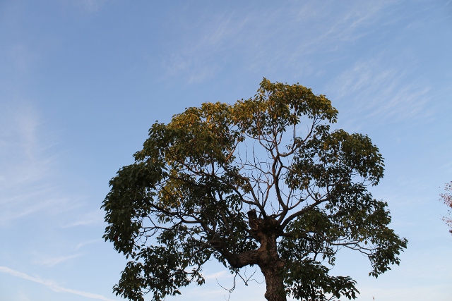 ど真ん中になんの木でしょうか?真ん中を切られているのにもかかわらず青空に精一杯枝を広げていました。