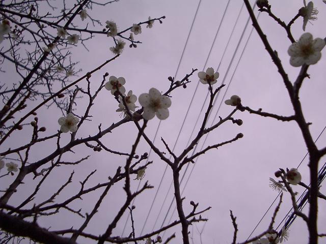 ちょっと暗いですが、公園の梅が咲き始めました。夕方の光の中で白く光っていました。