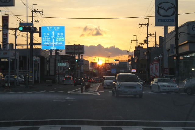 真っ赤な太陽がくっきりときれいに見えたので、カメラを助手席に置いて赤信号で止まるのを待ちました。